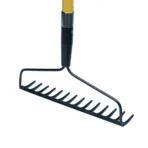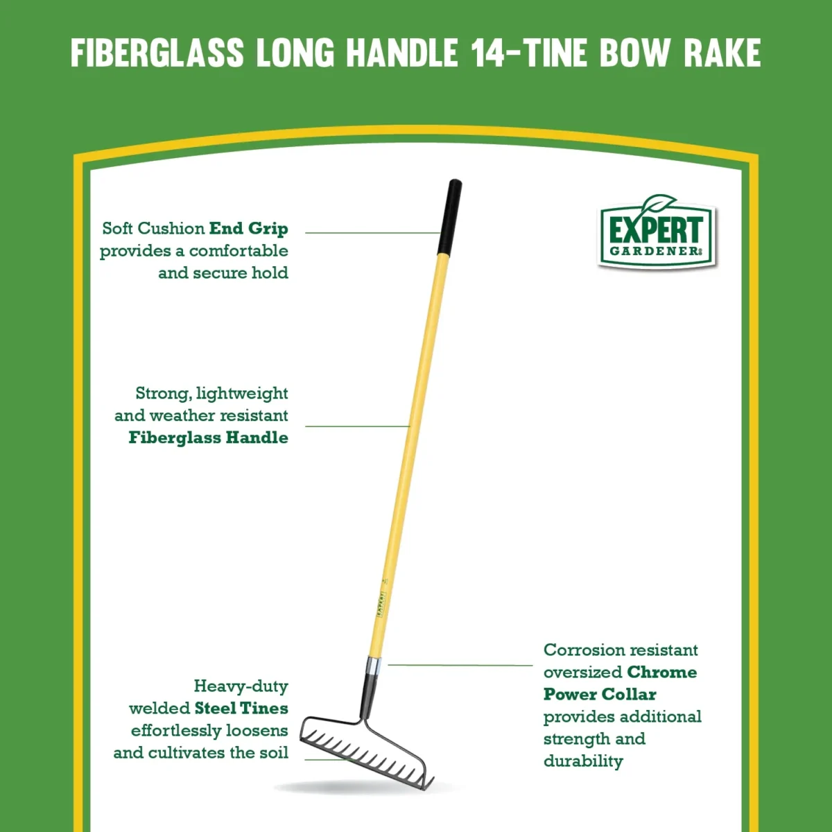 The Expert Gardener Fiberglass Long Handle 14-Tine Bow Rake is a durable and comfortable gardening tool designed to reduce strain on the back and knees. It features a  reinforced fiberglass handle  with a  deluxe control grip , oversized chrome collar, and  weather-resistant hammertone finish blades . The rake has  14 welded carbon steel tines  that effectively loosen, level, and cultivate soil, as well as weed, spread mulch, and rake leaves. Measuring 58.86″ x 13.98″ x 3.15″, it is ideal for efficient storage. With its long handle and  angled bow-shaped head , this rake is perfect for gardening tasks, providing a comfortable and secure hold for users.
